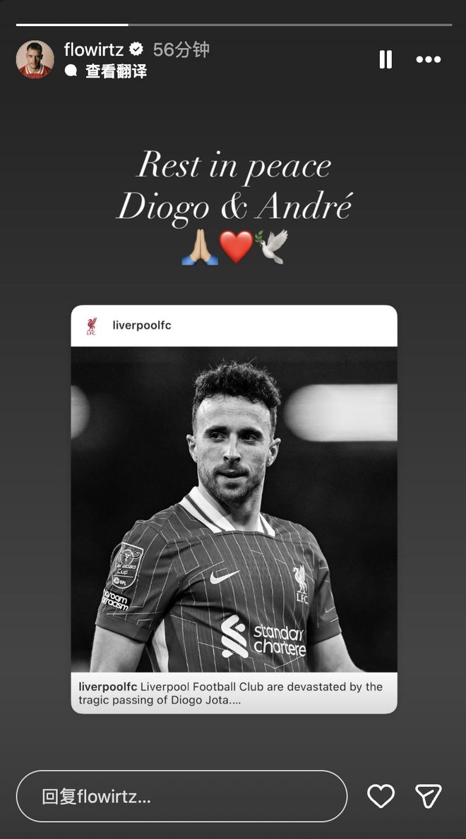 雷速体育7月4日讯 北京时间7月3日,利物浦球星迪奥戈·若塔与弟弟安德烈因车祸不幸离世。买球赛的网站 利物浦新援维尔茨在社媒转发了利物浦官方公告悼念若塔兄弟,“安息吧,迪奥戈&安德烈。”世界杯买球平台 维尔茨在今年夏天才刚刚加入利物浦,尚未与若塔有过共同登场。球探足球比分